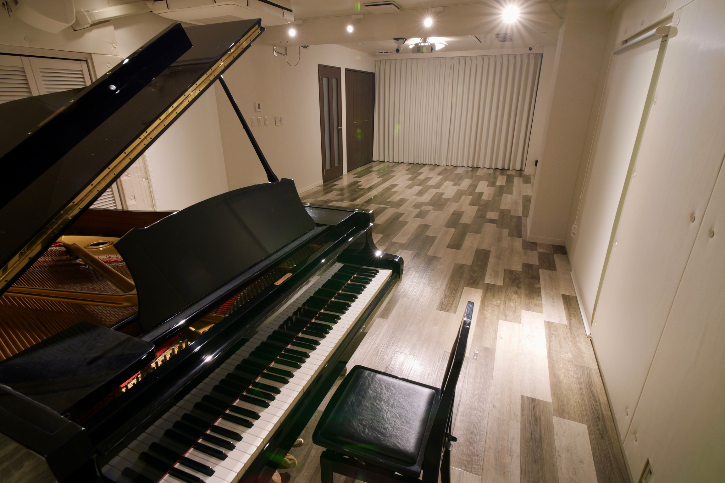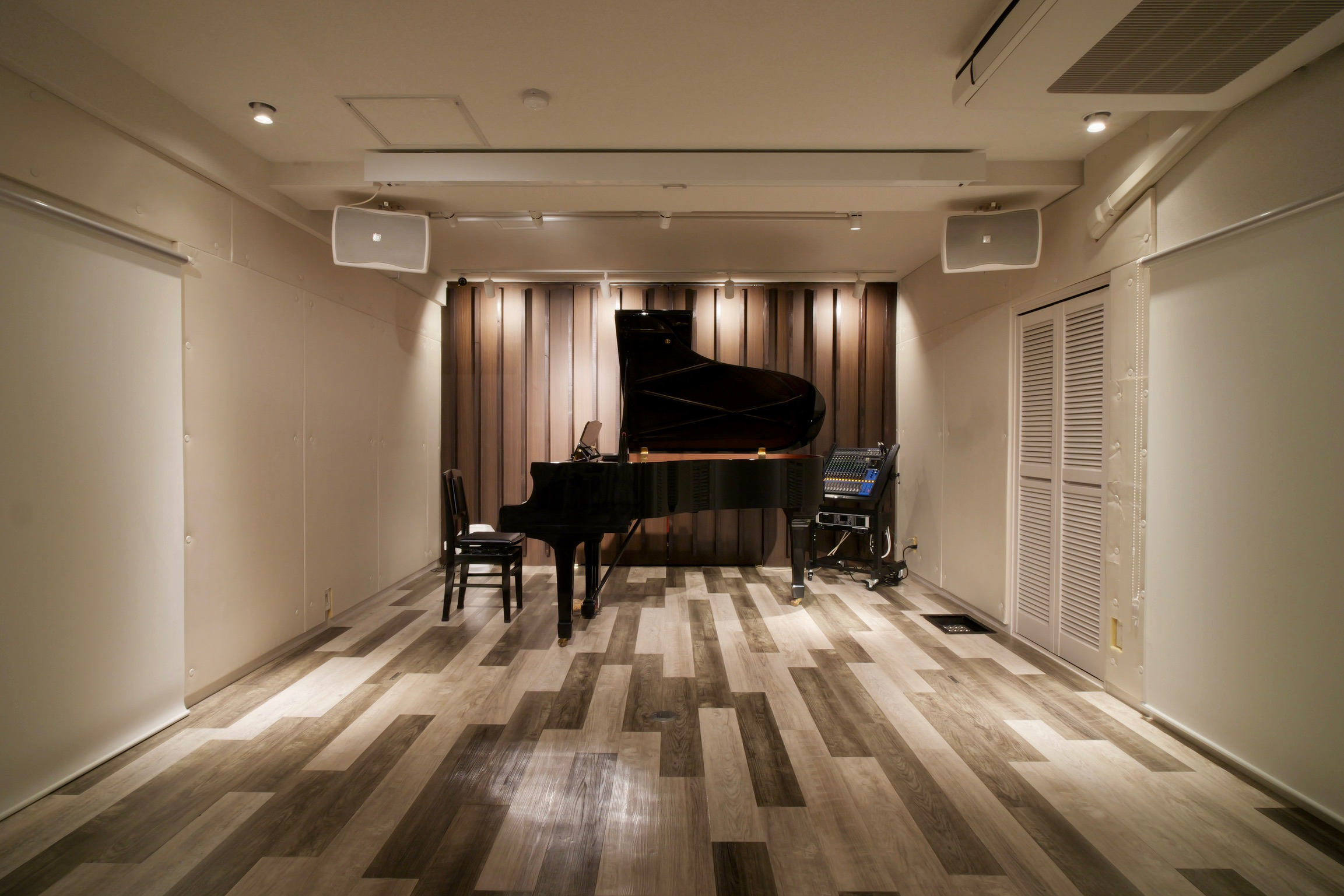 6階は白を基調にした38平米のスタジオ空間です。ピアノソロやバンド演奏、ダンスレッスンなどリハーサルからライブ配信まで多目的に使えるクリエイティブな空間になっています。